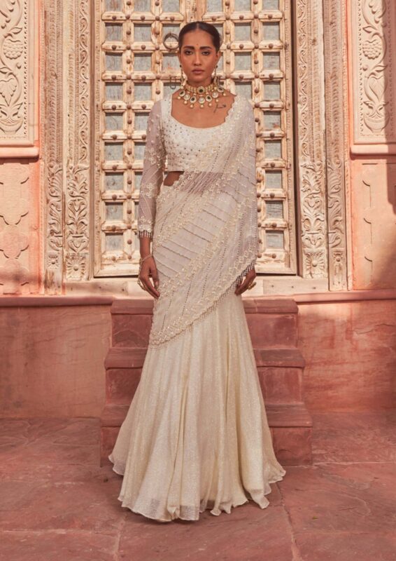 Orange Crepe Saree with Embroidered Cape | Designer Reception Wear