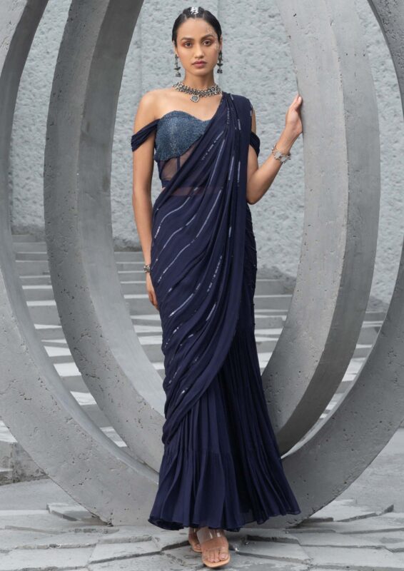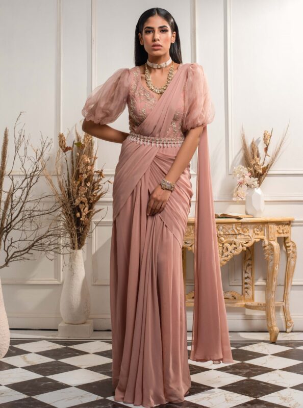 Satin Embroidered Draped Saree | Elegant Wedding & Reception Wear