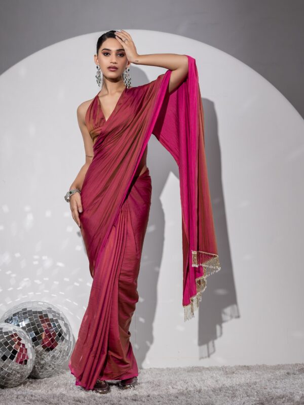 Mulberry Wine Net Saree with Embroidery and Scalloping