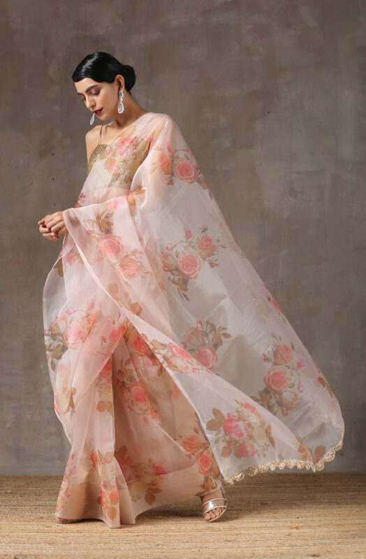 Cream Gold Floral Net Chiffon Saree with Designer Blouse for Festive Wear