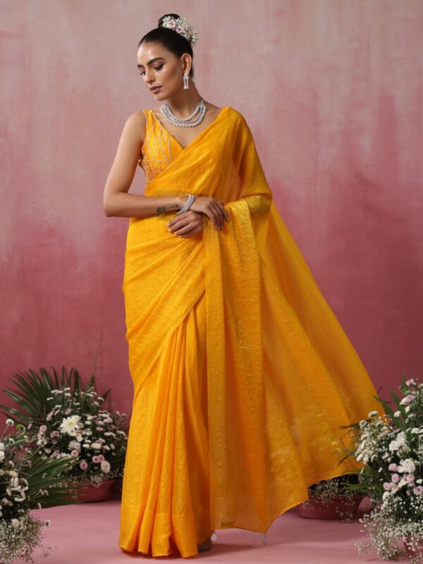 Bee Yellow Metallic Crushed Satin Saree with Hand-Beaded Blouse Fabric