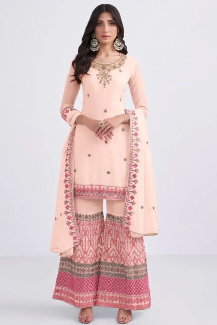 Wonderful Peach Thread Embroidery Georgette Sharara Suit