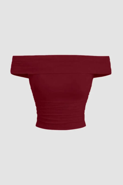 Maroon Off-Shoulder Ruched Evening Crop Top
