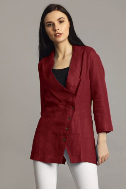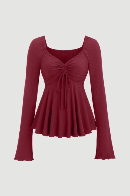 Maroon V-Neck Drawstring Long Sleeve Stylish Top