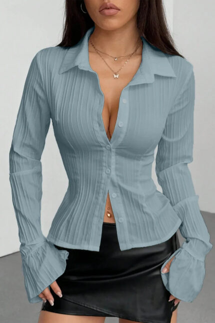 Powder Blue Pleated Button Down Shirt with Flared Cuffs