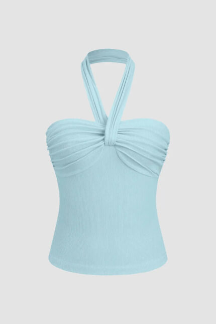 Powder Blue Ruched Halter Neck Flattering Crop Top