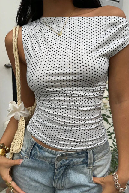 Polka Dot One-Shoulder Asymmetric Statement Top