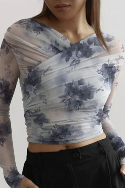 Sheer Mesh Long Sleeve Ruched Wrap Statement Top
