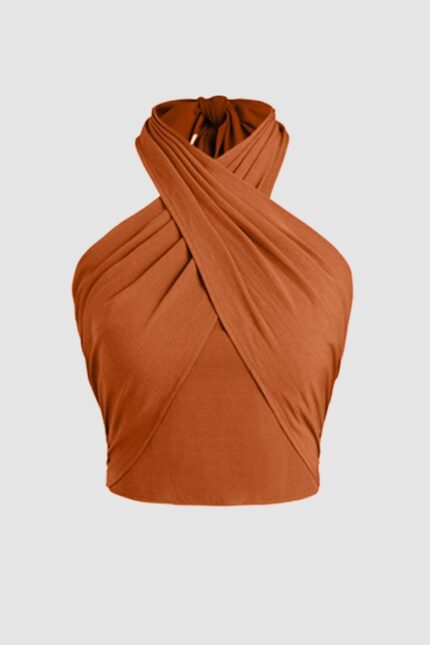 Rust Orange Cross Halter Shirred Back Statement Crop Top