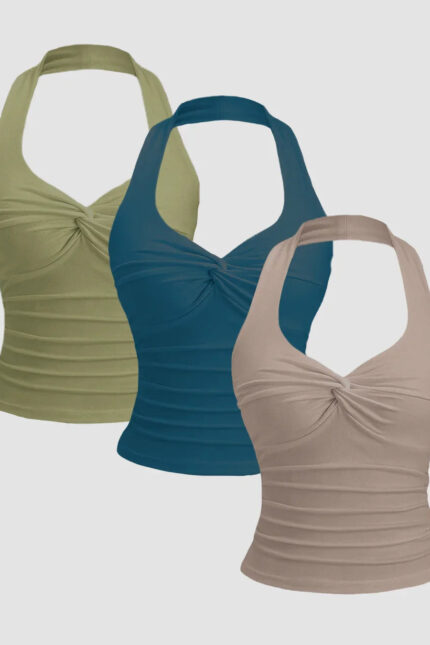 Ruched Halter Neck Combo Crop Tops in Sage Beige and Teal