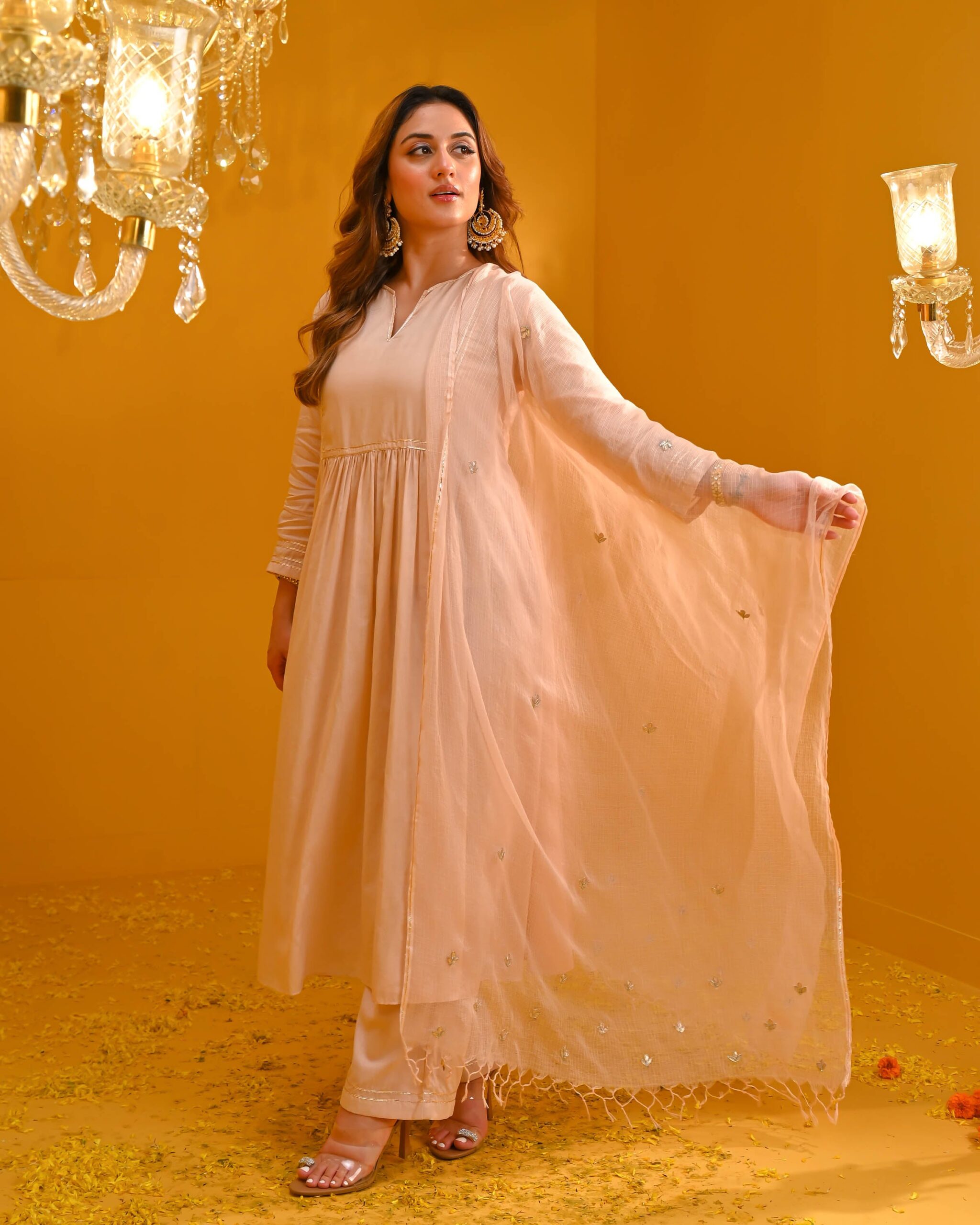 Elevate your ethnic wardrobe with the Aaradhya Cotton Suit Set, crafted from plush cotton in a beautiful peach hue. The flared Anarkali-style kurta features a round neck with a notch and gota lace detailing on the yoke, along with three-quarter sleeves. Paired with matching pants and a Kota Doriya dupatta adorned with gota embellishments, it’s perfect for any festive occasion.