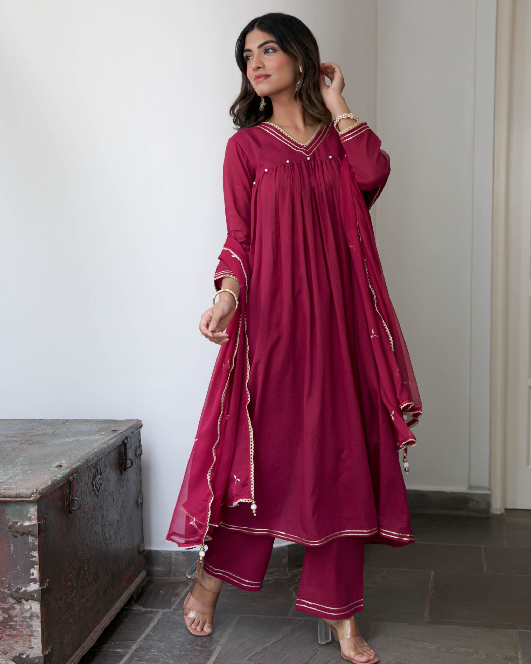 Embrace classic elegance with the Aarohi Cotton Suit Set. Crafted in rich maroon cotton, this A-line kurta features a flattering V-neck and three-quarter sleeves, creating a timeless silhouette. Paired with matching pants and a coordinating dupatta, this ensemble offers comfort and style, perfect for festive occasions, casual gatherings, and traditional celebrations with a touch of sophistication.