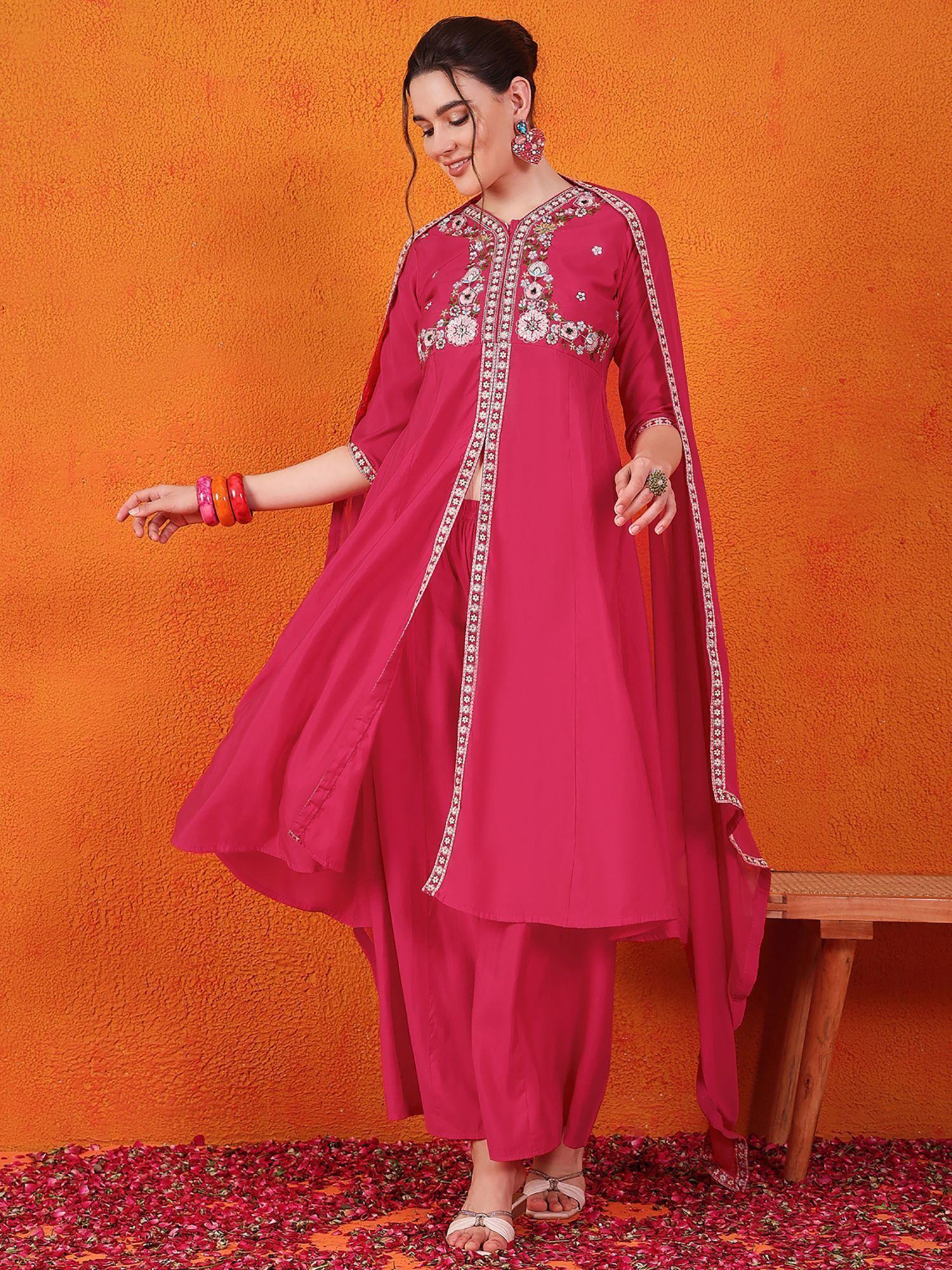 The pink silk suit is not just a piece of clothing, but a statement of style and elegance. The luxurious fabric, intricate work details, and thoughtful design make it a wardrobe staple that you will cherish for years to come. Whether you’re attending a wedding, a party, or a cultural event, this palazzo suit is sure to make you look and feel like a true fashionista.