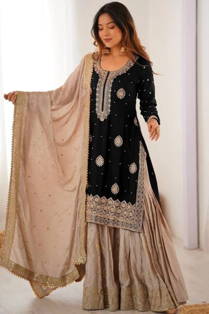 Elevate your style and make a statement with our attractive pink embroidered georgette traditional sharara suits. Crafted with precision and attention to detail, this suit is a perfect choice for weddings, festivals, and other special occasions. With its vibrant pink color, intricate embroidery, and sequin work, this suit is designed to turn heads. Complete with a matching sharara and dupatta, this set offers versatility and endless styling options.?