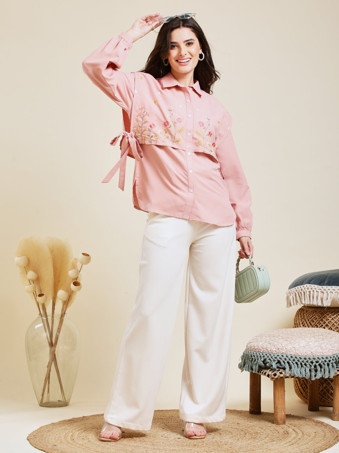 Baby Pink Viscose Blend Embroidered Shirt for Women