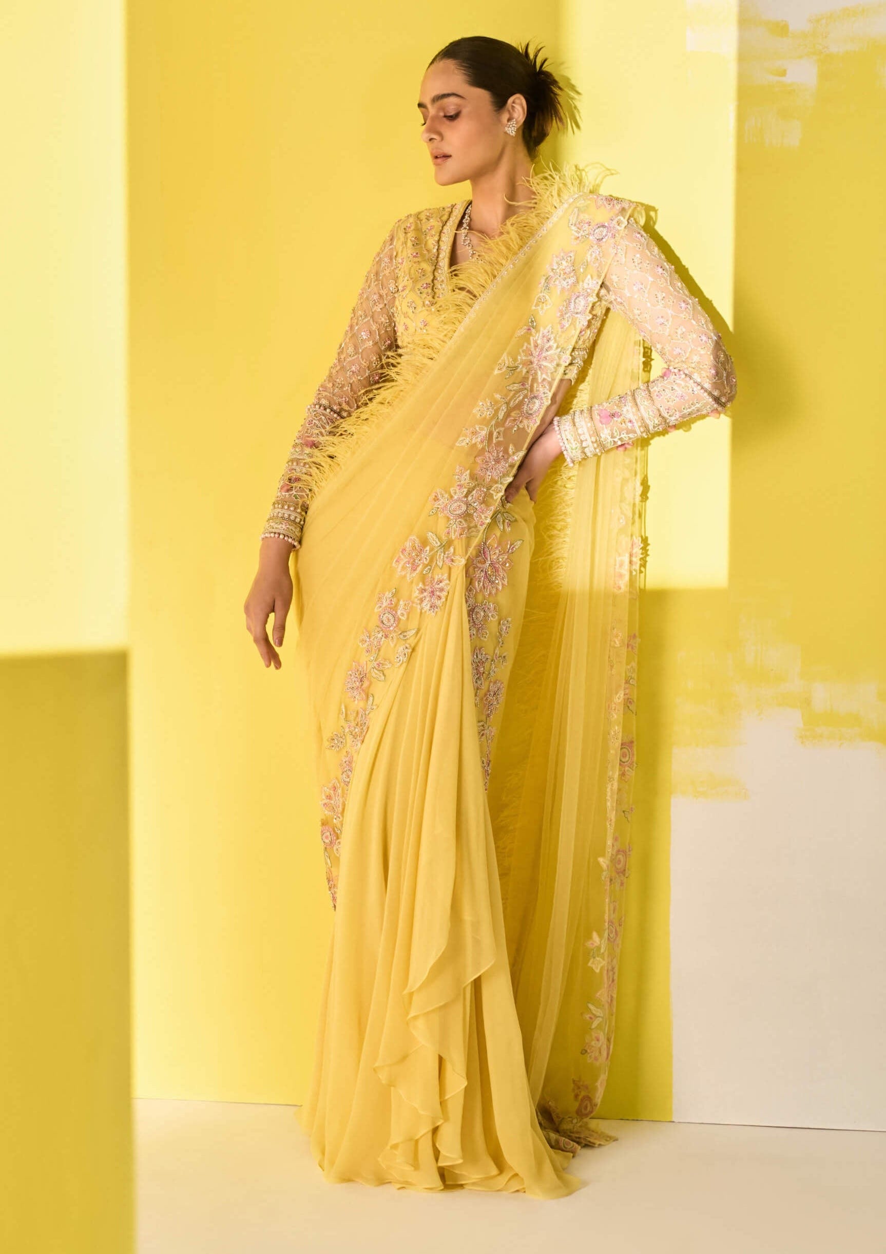 Basha Yellow Draped Saree Skirt Set for Women Festive Wear