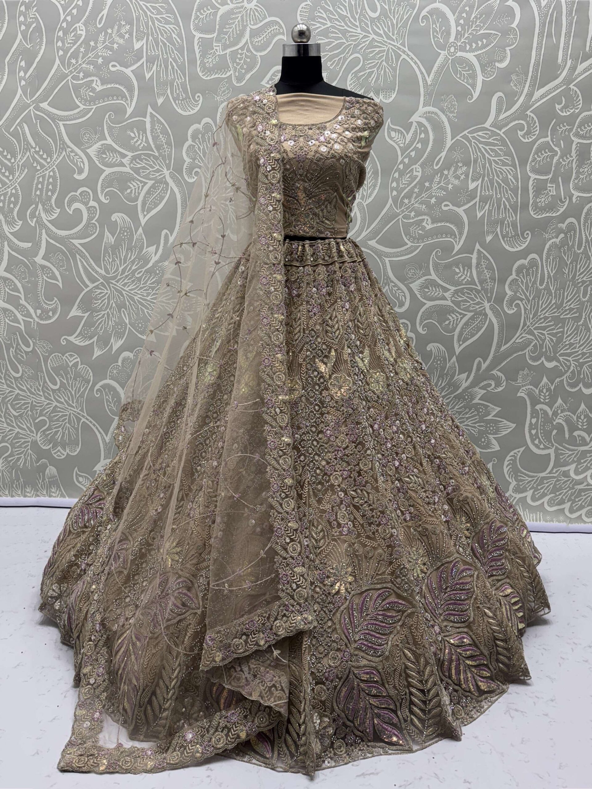 This elegant lehenga choli set is crafted from luxurious heavy net fabric and showcases stunning fancy embroidery that adds a royal charm.
