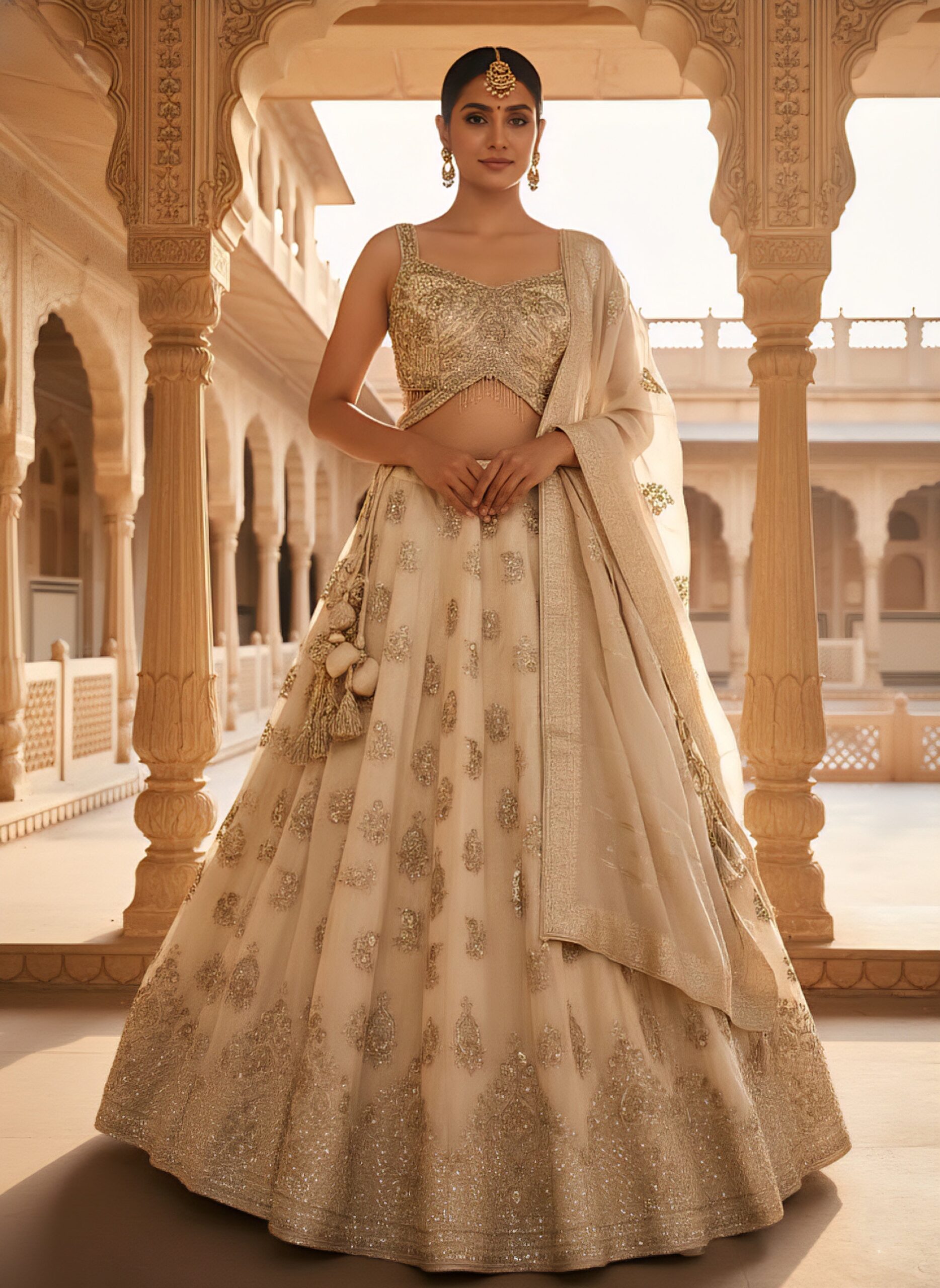 Elevate your festive wardrobe with this exquisite beige georgette ghagra set, meticulously crafted for the discerning bride. Adorned with intricate heavy zari embroidery and shimmering sequins, this ensemble captures timeless elegance with contemporary flair. The lightweight georgette fabric ensures graceful movement and all-day comfort, while the ornate detailing creates a striking visual impact. Perfect for weddings, celebrations, and special occasions, this sophisticated piece seamlessly blends traditional craftsmanship with refined aesthetics.?