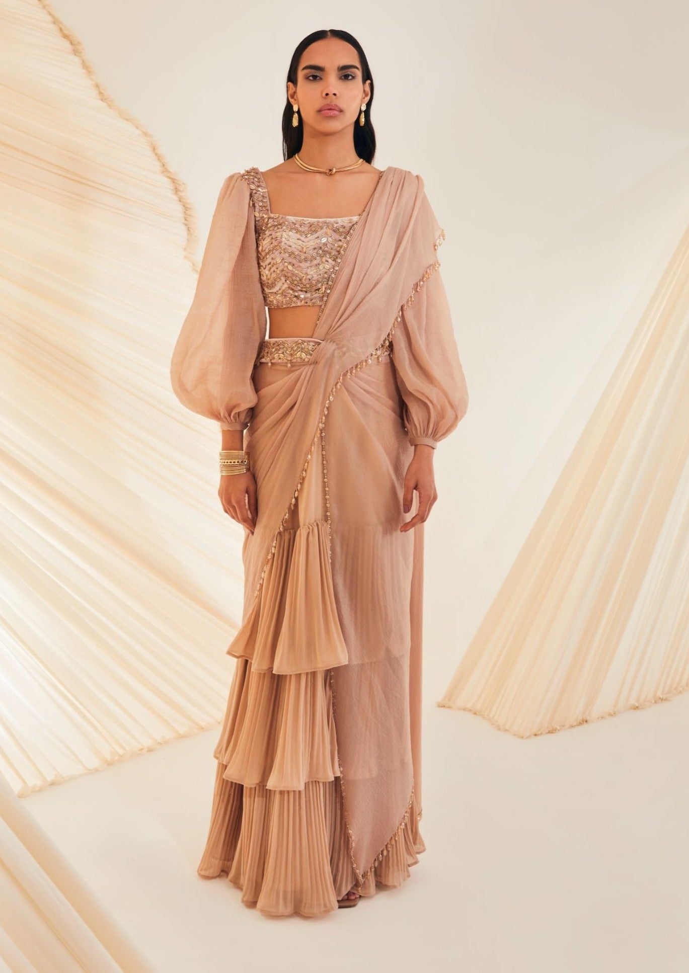 Home Saree Beige Minimal Pre Draped Saree Set for Women