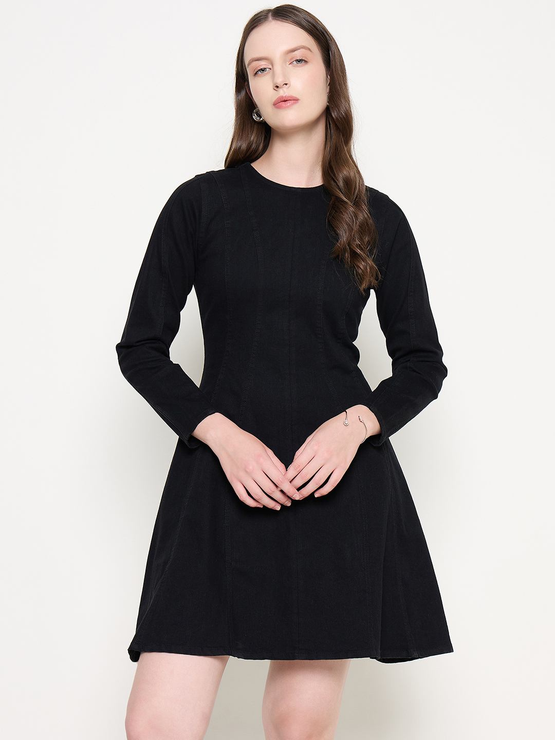 This black dress adds a touch of sophistication to your casual wardrobe. Designed with a flattering panel stitch detail that accentuates the silhouette, this dress brings structure while maintaining effortless charm. The long sleeves make it perfect for cooler days, giving it an autumn-ready feel. Crafted from premium denim, it offers a comfortable fit with just the right amount of stretch. Dress it up with heels and minimal jewelry for a chic outing, or pair it with sneakers for an elevated casual look.