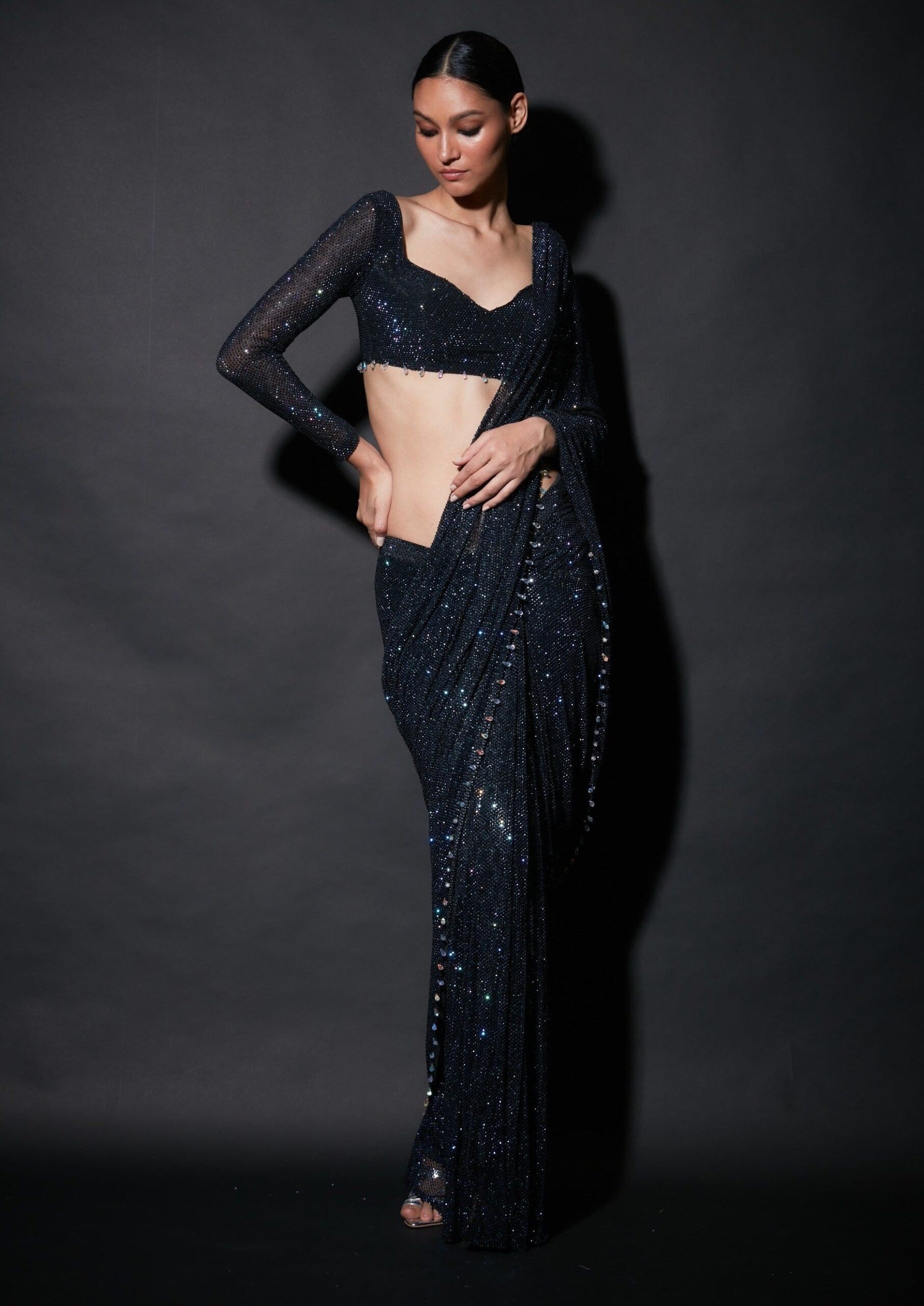 Be the first to review “Black Embellished Pre Draped Saree with Blouse for Women” Cancel reply