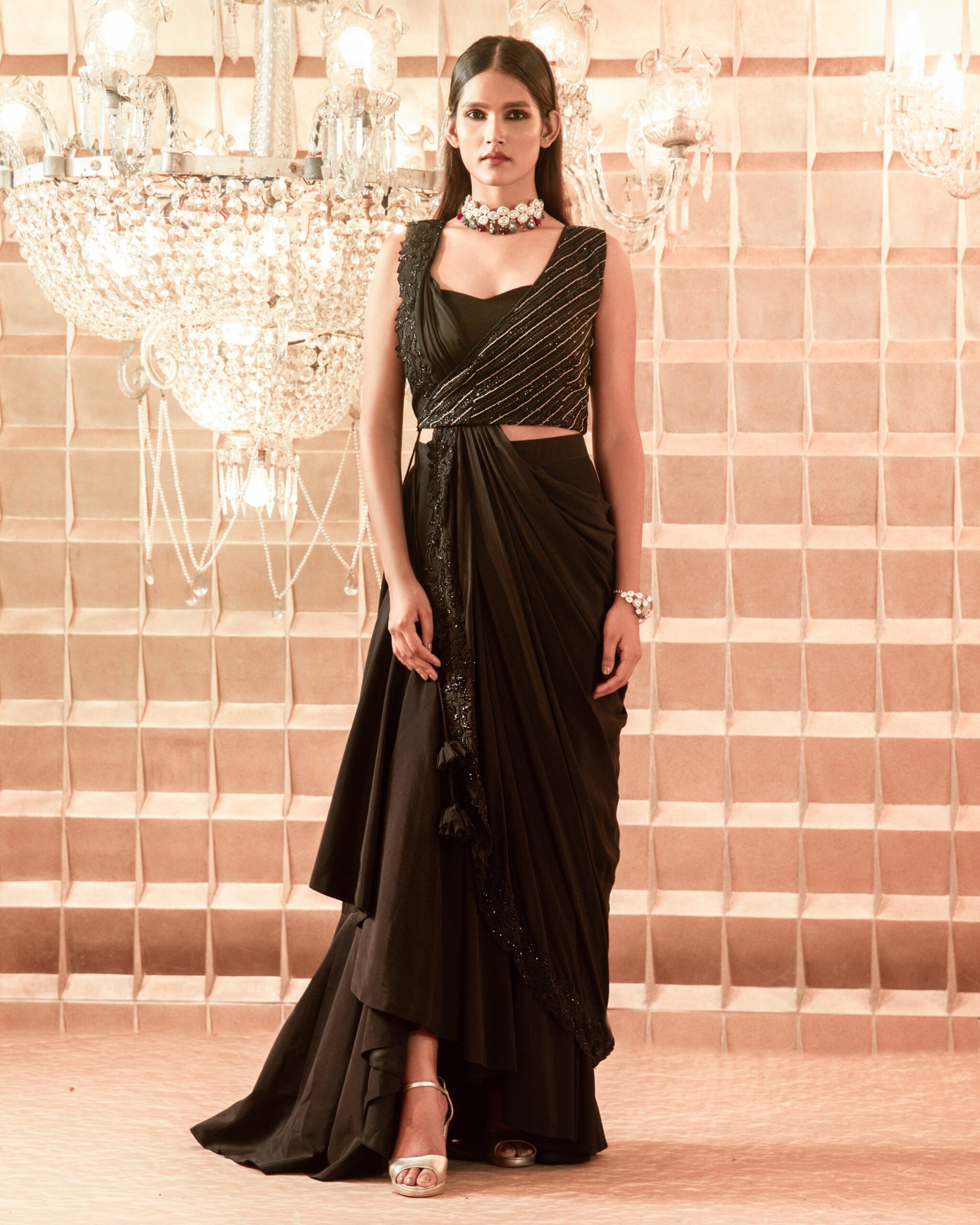 Be the first to review “Black Embroidered Draped Saree Skirt Set for Women Party Wear” Cancel reply