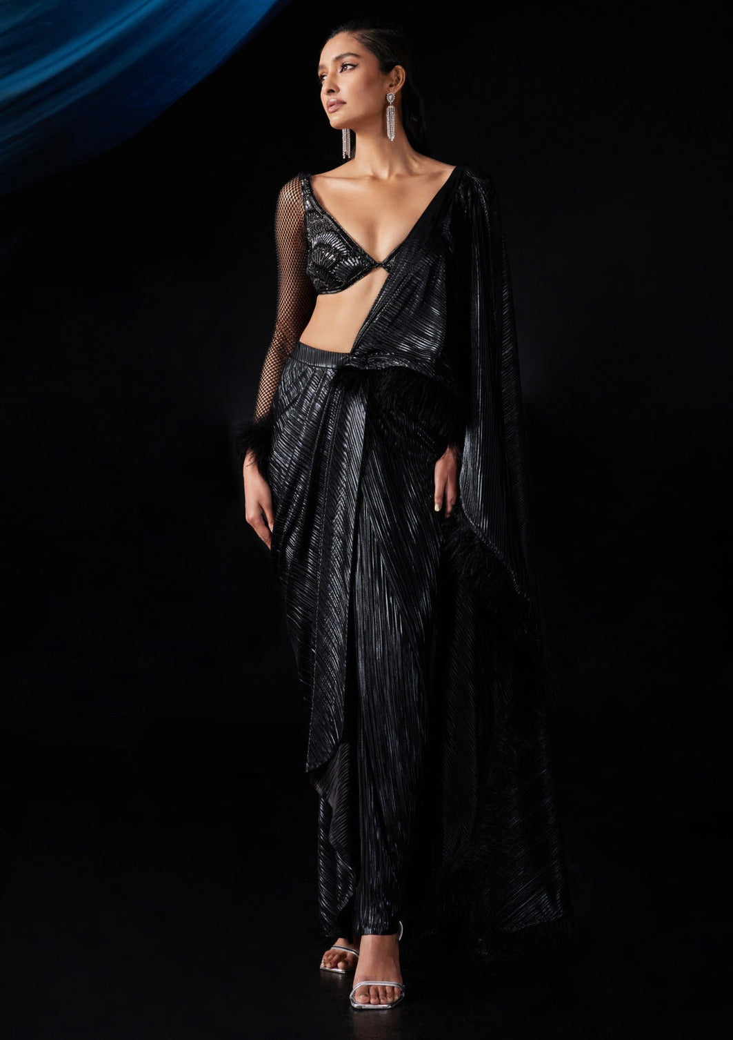 A detailed black drape?Saree paired perfectly with an opulent hand embroidered blouse and accessorised?using the most delicate feathers.