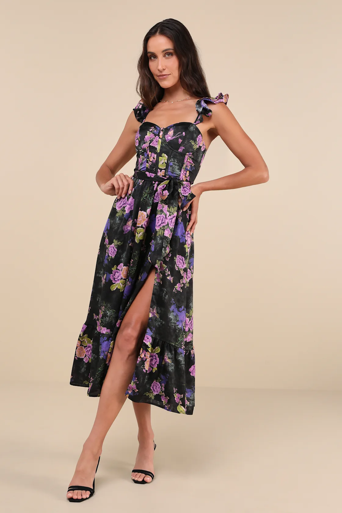 Bring a touch of romance and elegance to your wardrobe with this Black floral ruffled bustier midi dress. Crafted from soft, high-quality fabric, this dress features a flattering bustier silhouette with delicate ruffle detailing for a feminine and stylish appeal.