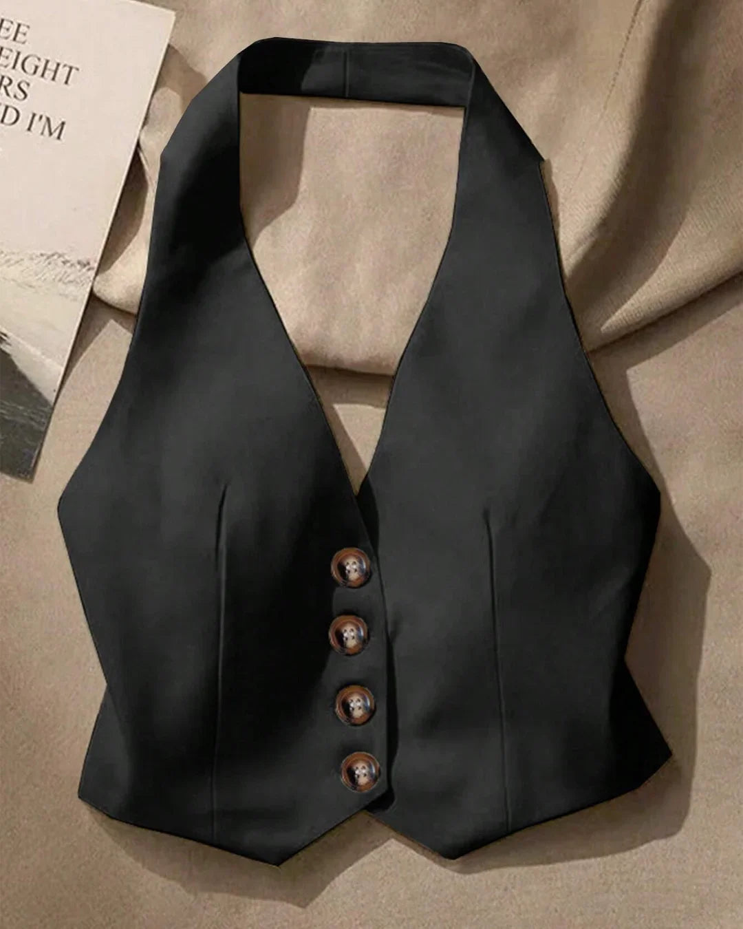 Halter neckline with button-front design adds tailored edge