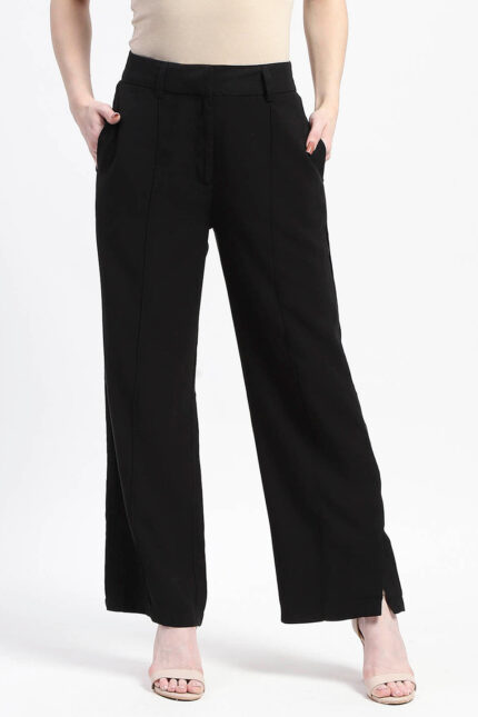 Pleat Detailed Solid Black Flared Women Trousers Premium Finish