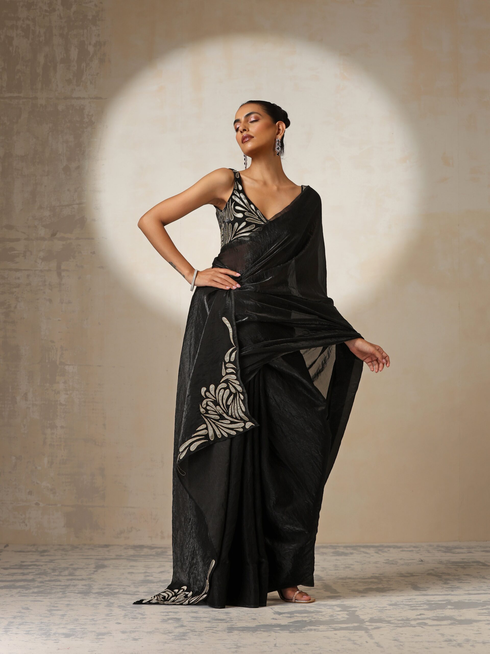 Black Metallic Crushed Satin Saree with Bronze Embroidery and Blouse Fabric,”Crafted in metallic crushed satin, this black saree shimmers with rich bronze embroidery for a striking festive look. The textured fabric creates depth and movement while maintaining a fluid drape. Comes with coordinated blouse fabric, ideal for evening events and receptions.”