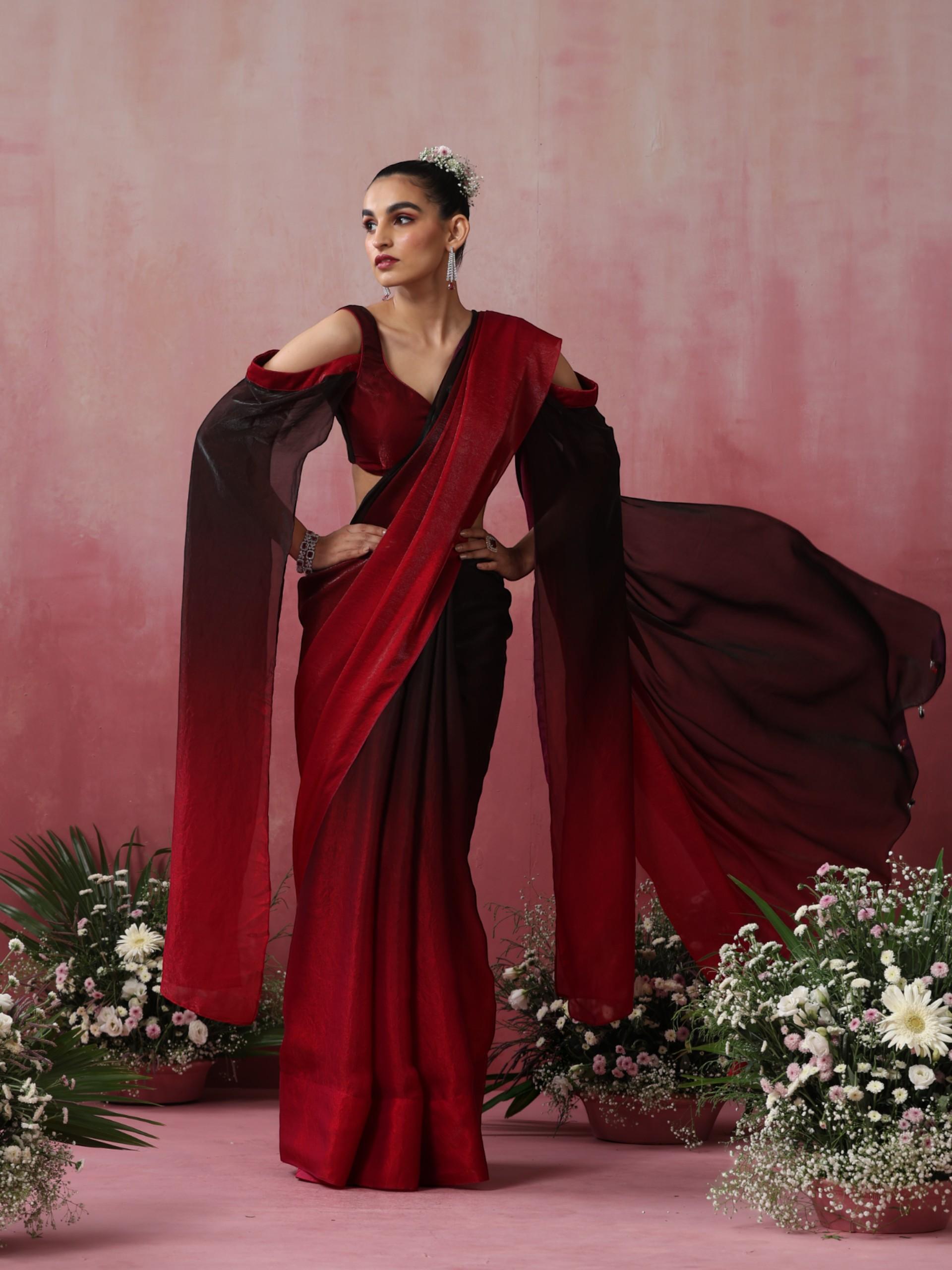 Black & Red Ombre Metallic Satin Saree with Dramatic Finish