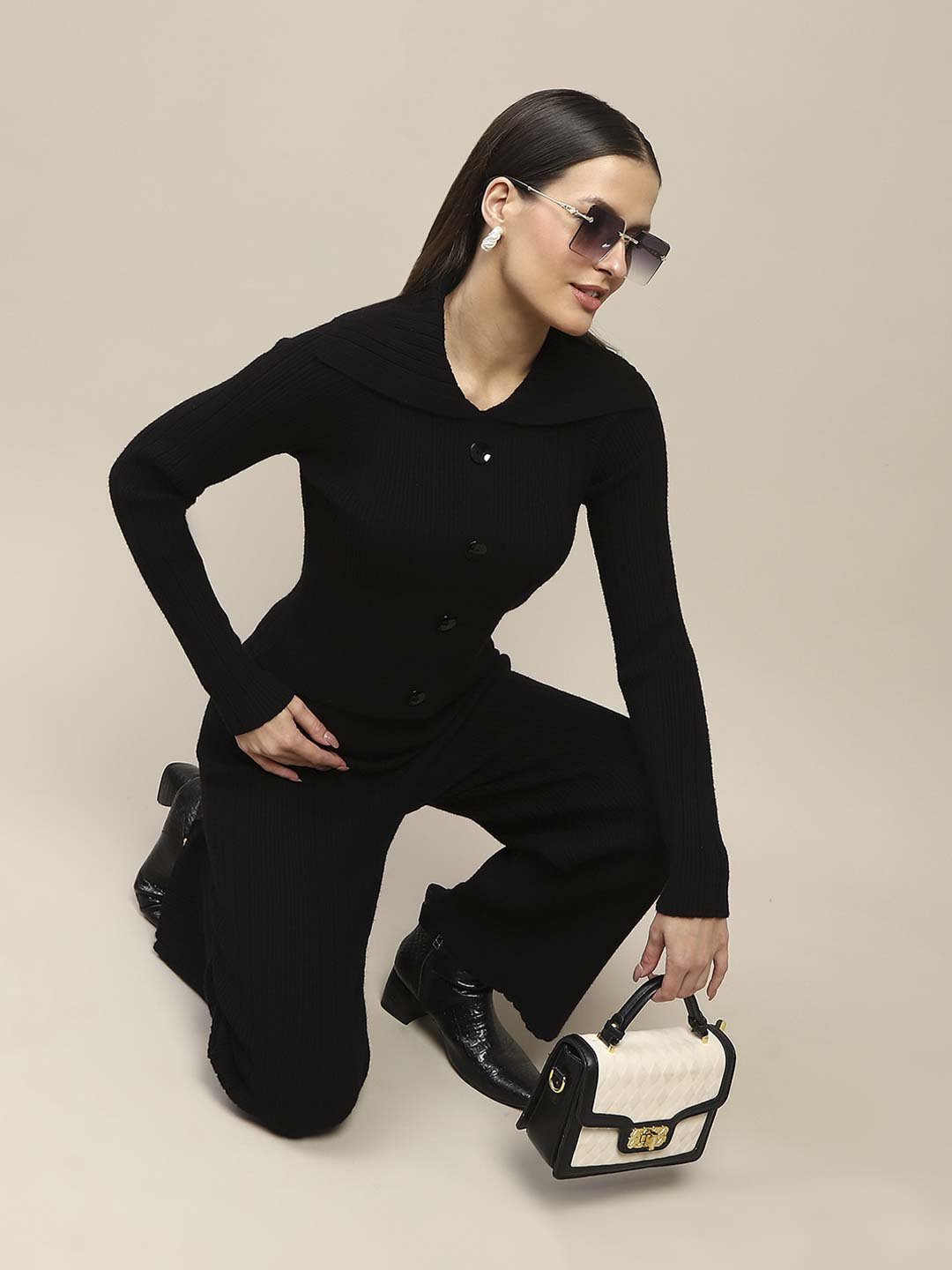 Black Solid Knitted Top and Bottom Cozy Co-ord Set