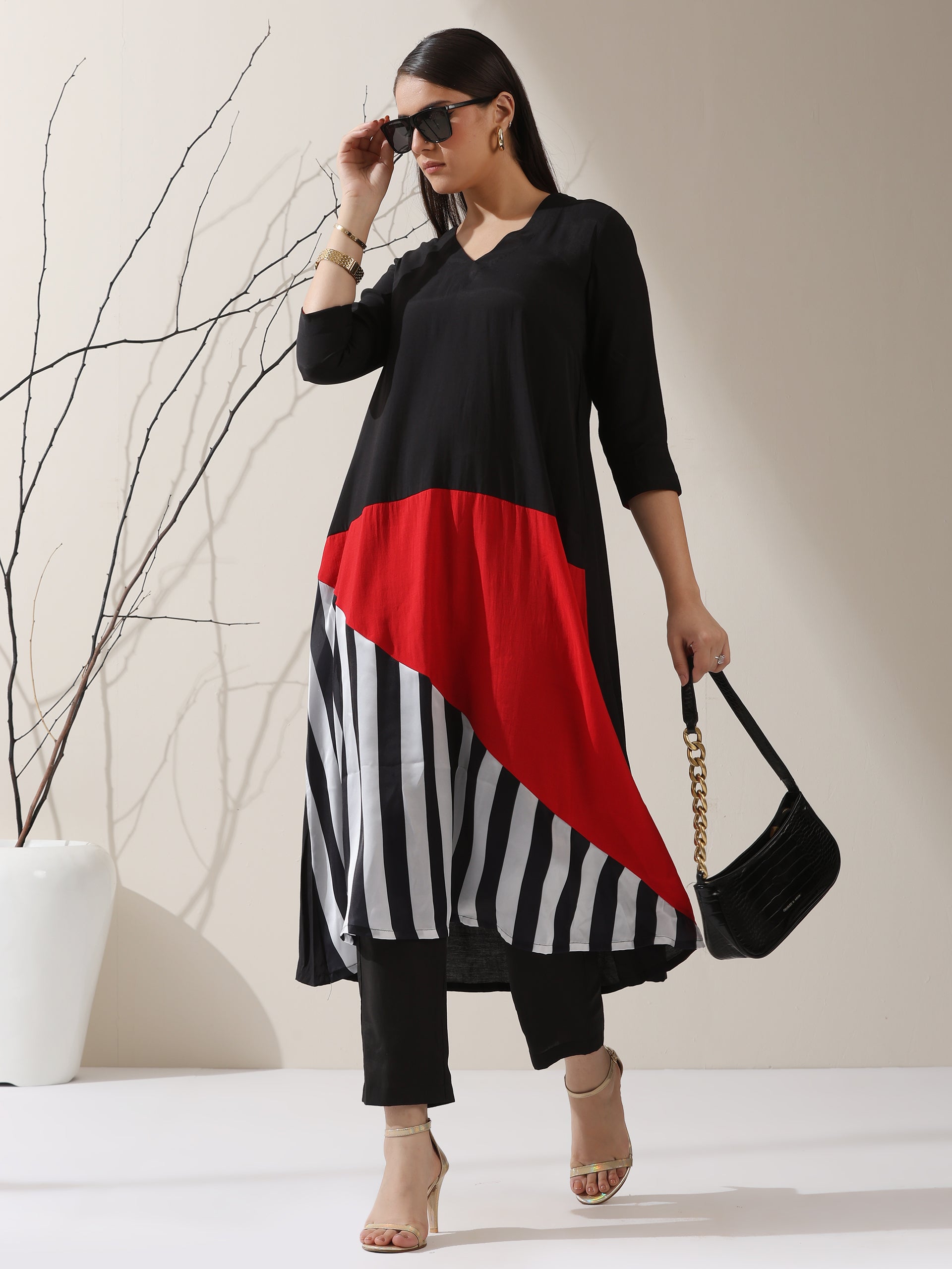 Black Triangle Color Block Kurta Set,”A black triangle color block kurta set paired with pants.”