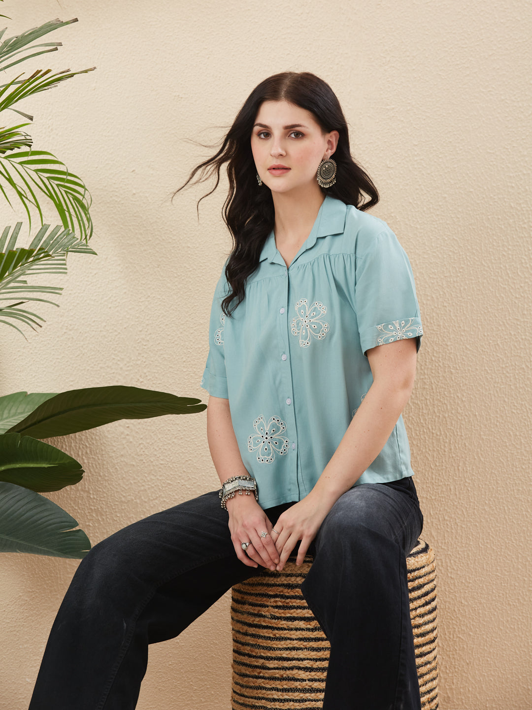 Home Women Shirt Blue Rayon Embroidered Regular Fit Shirt for Women