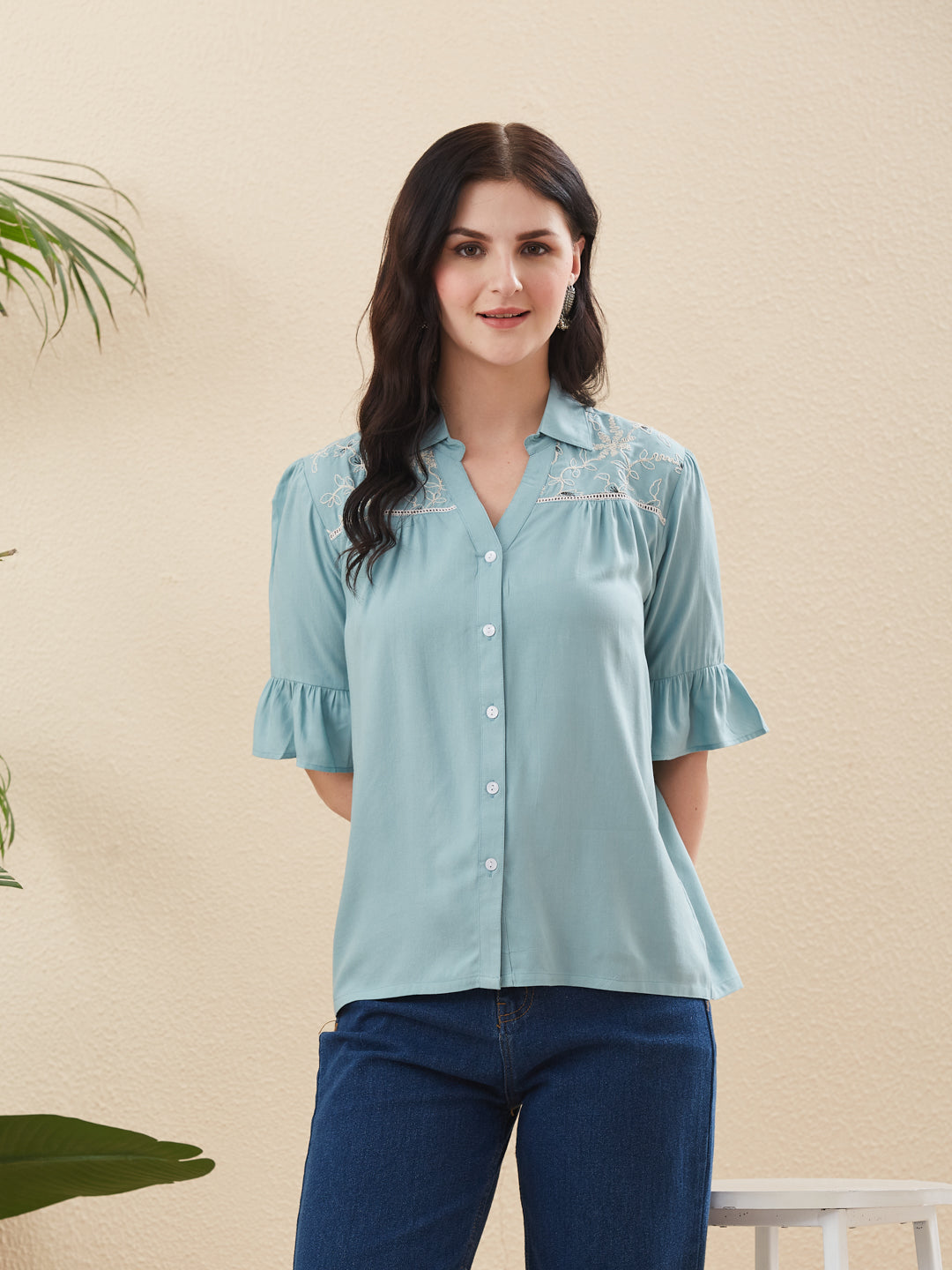 Blue Rayon Embroidered Shirt for Women