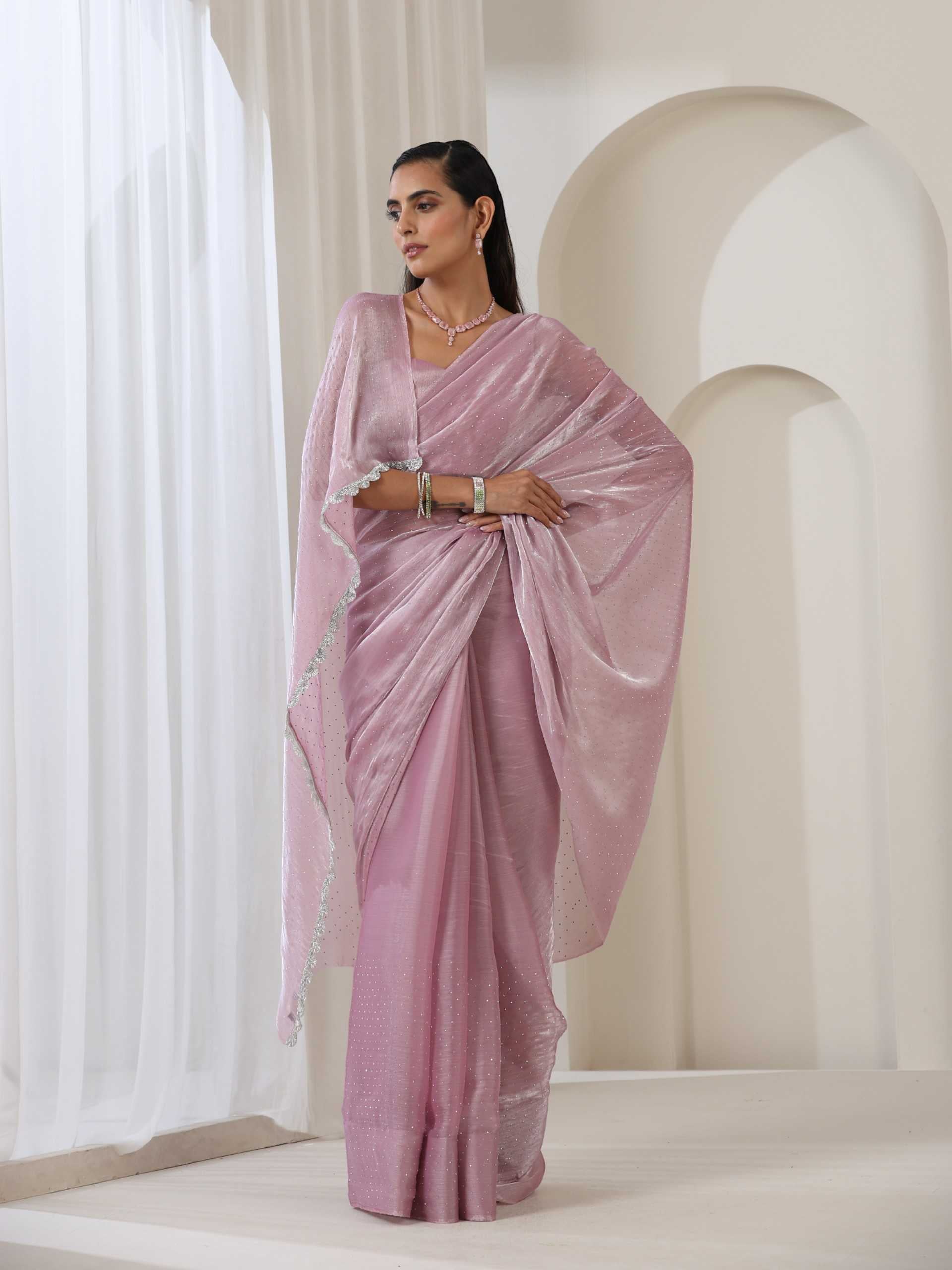 Blush Organza Saree with Swarovski Style Sparkle and Blouse Fabric,”A romantic blush organza saree adorned with Swarovski-style sparkle that catches the light beautifully. Paired with matching blouse fabric, it is perfect for glamorous celebrations and special occasions.”