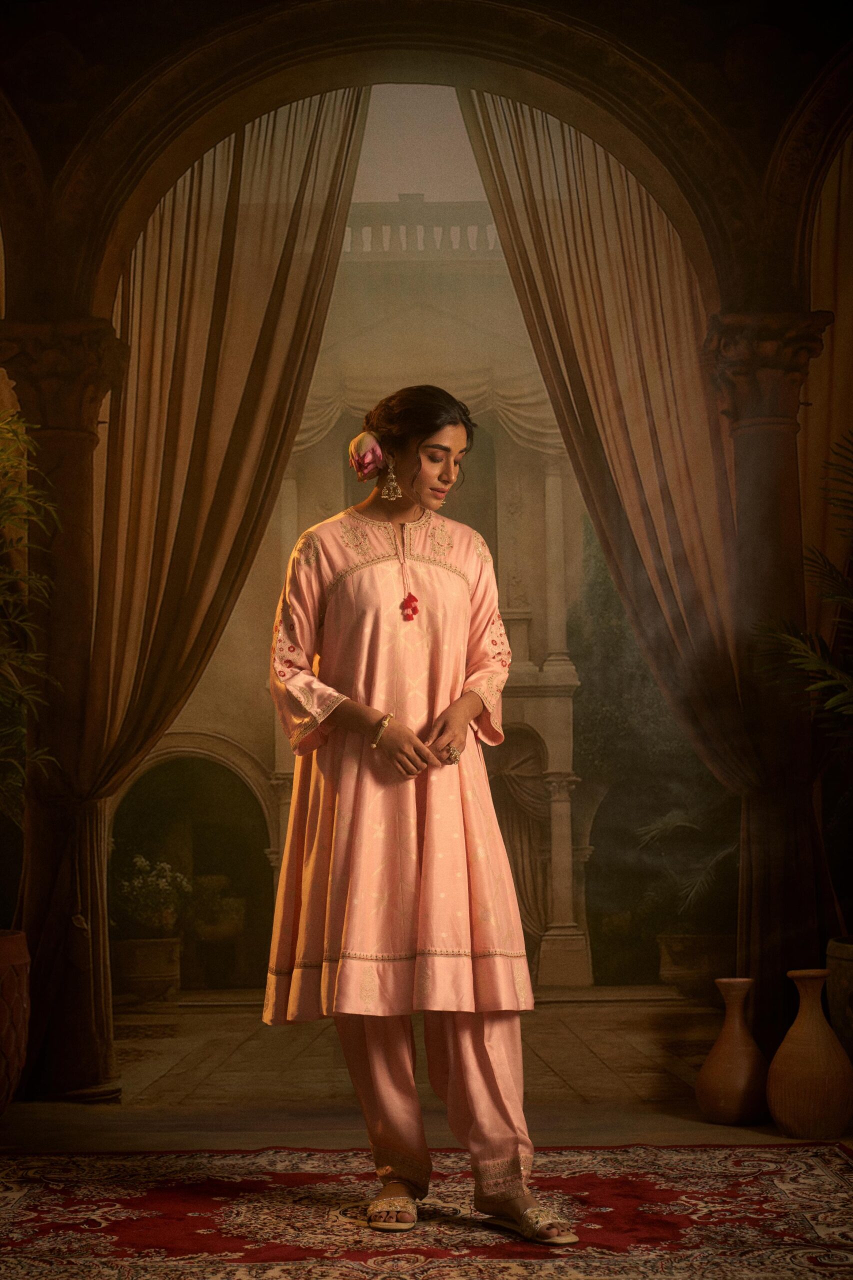 Elevate your ethnic wardrobe with this beautifully crafted Blush Pink Embellished Anarkali Set in breathable cotton linen. Designed for comfort and elegance, the flowy silhouette offers a graceful drape, making it perfect for festive occasions and intimate gatherings. The kurta is adorned with delicate handwork, featuring intricate zarkan, shimmering sequins, and elegant lace detailing that add a subtle shimmer and refined charm. Paired with a comfortable salwar-style pant and a matching dupatta, this ensemble creates a complete and polished look.