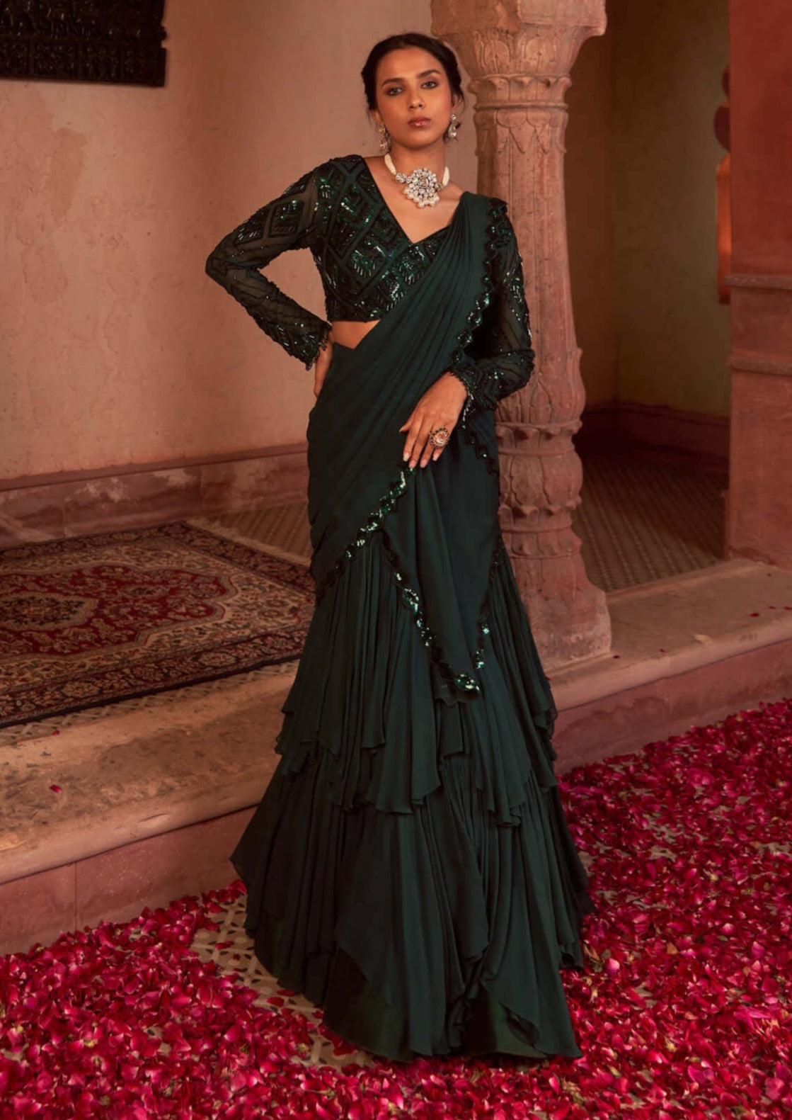 Gordes Pre-Draped Indo-Western Saree with Hand Embroidered Western Blouse