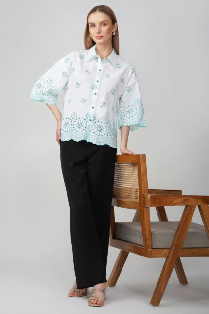 Mint Breeze Embroidered Oversized Cotton Shirt for Women