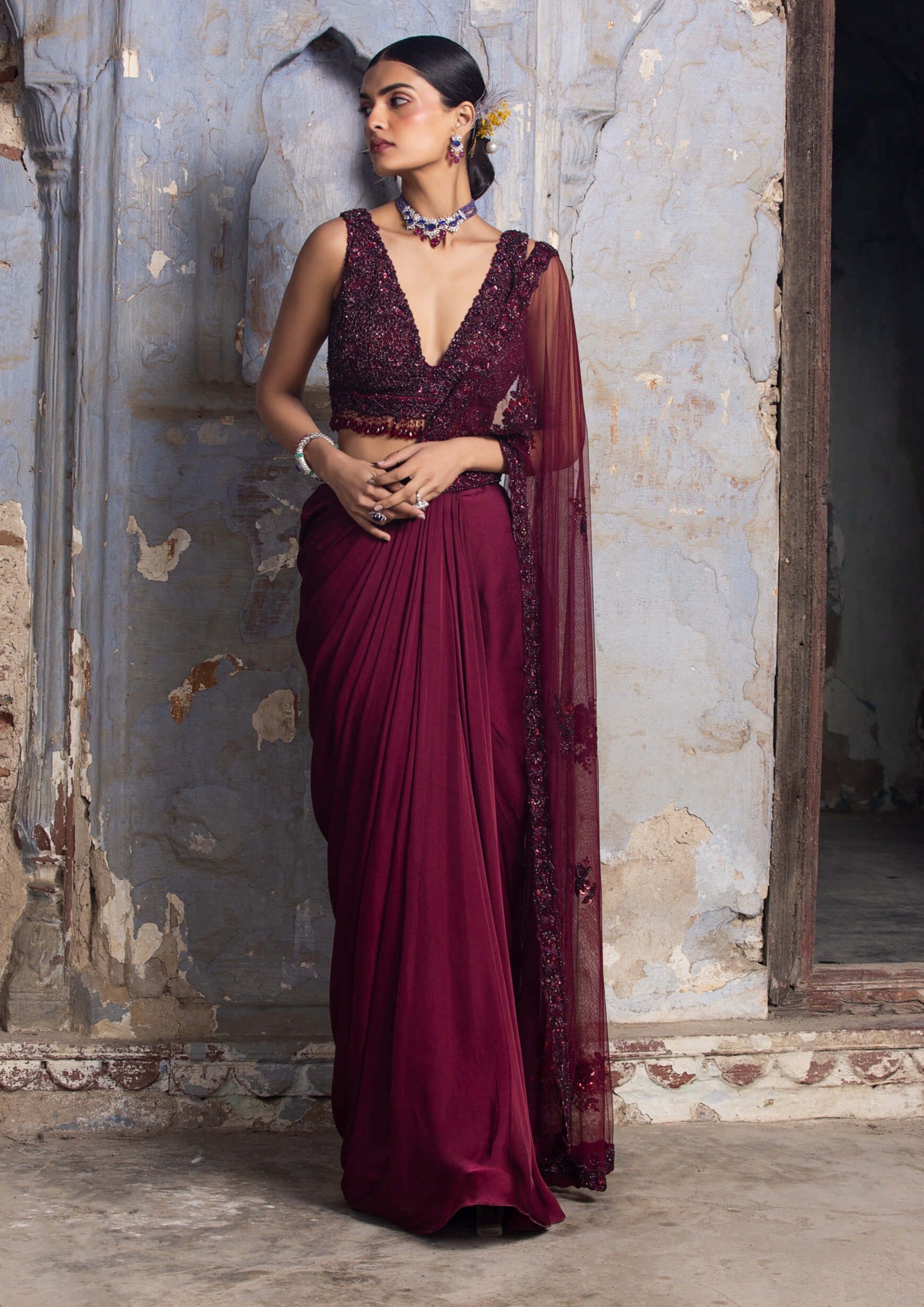 Burgundy Satin Draped Saree with Blouse for Women Party Wear