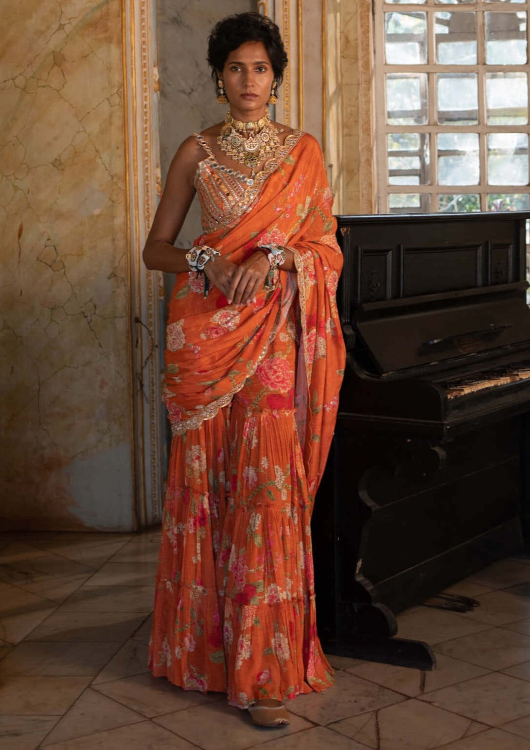 Fit: Fitted at bust and waist, attached lining blouse and?Saree back opening side zip Saree