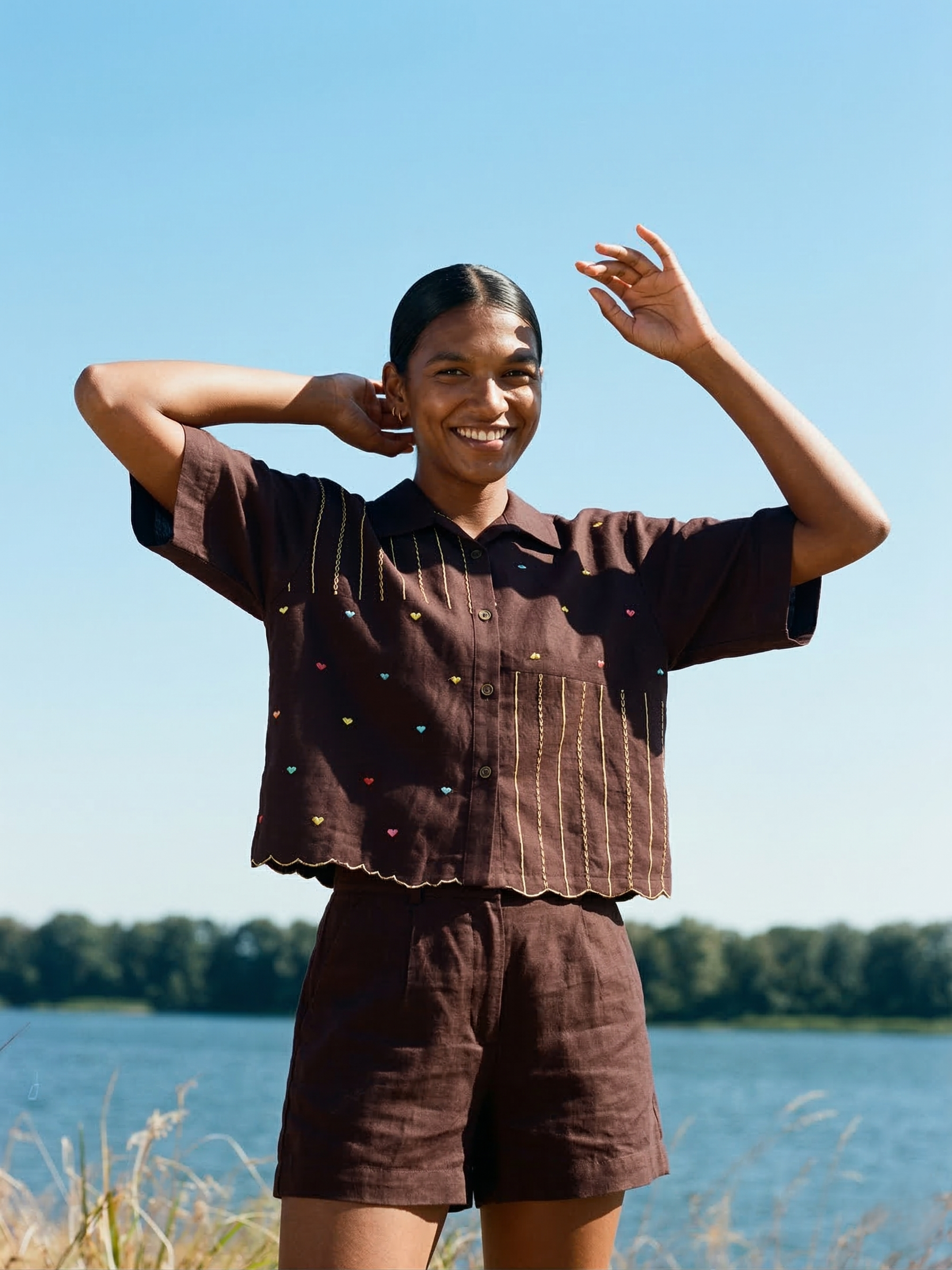 Home Women Shirt Coffee Crepe Embroidered Regular Fit Shirt for Women