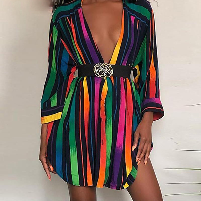 Casual Block Rainbow Color Collar Striped Sexy Turn Down Women Dress