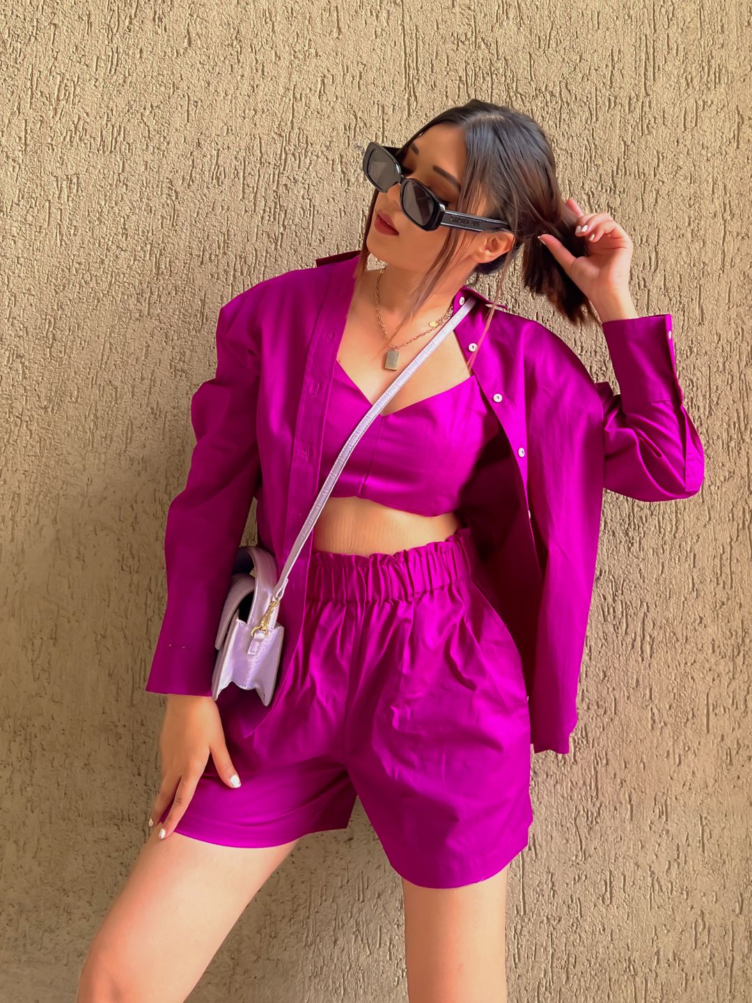 Cotton Three Piece Shorts Shirt and Crop Top Set for Women Casual Wear