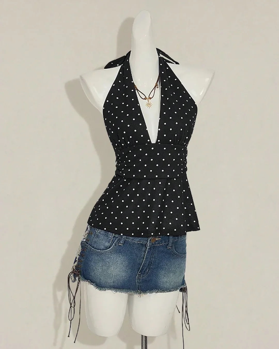 Deep V Polka Dot Halter Neck Wrap Style Statement Top