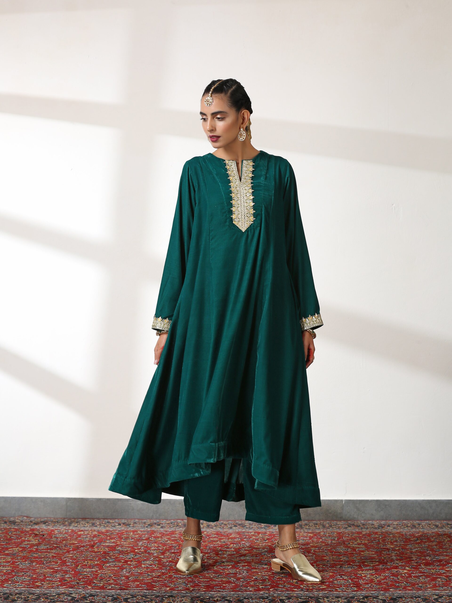 Emerald Velvet Co-Ord Set with Gota Lace,”A rich emerald velvet co-ord set adorned with gota lace detailing. Perfect for winter festivities and celebrations.”