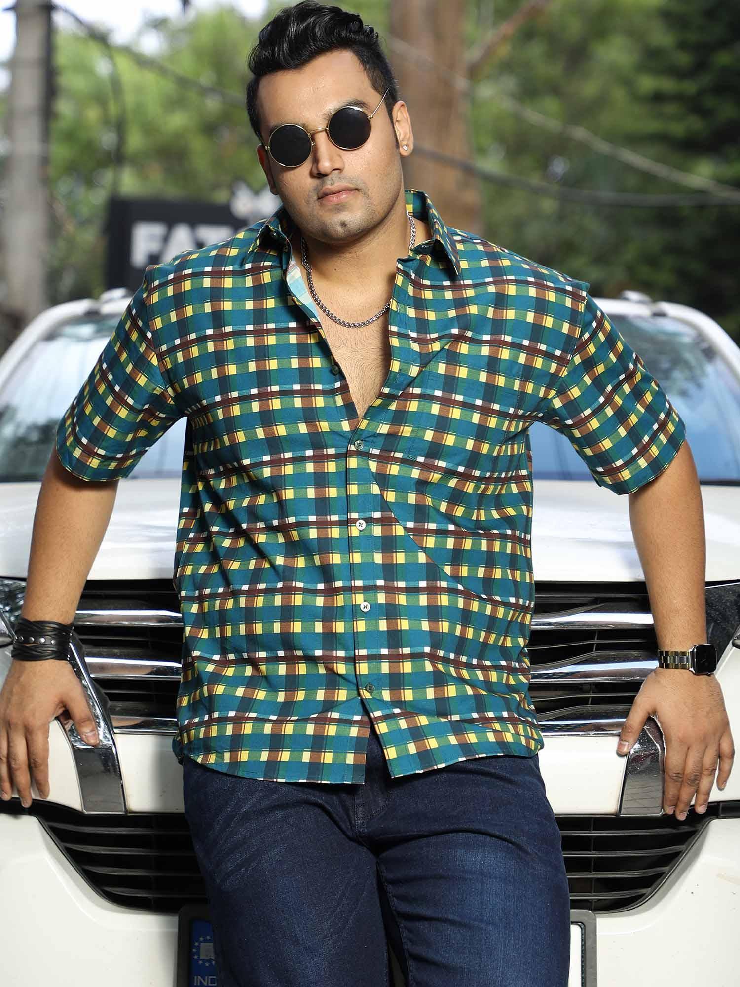 Emerald Yellow Check Cotton Men Plus Size Half Sleeve Shirt