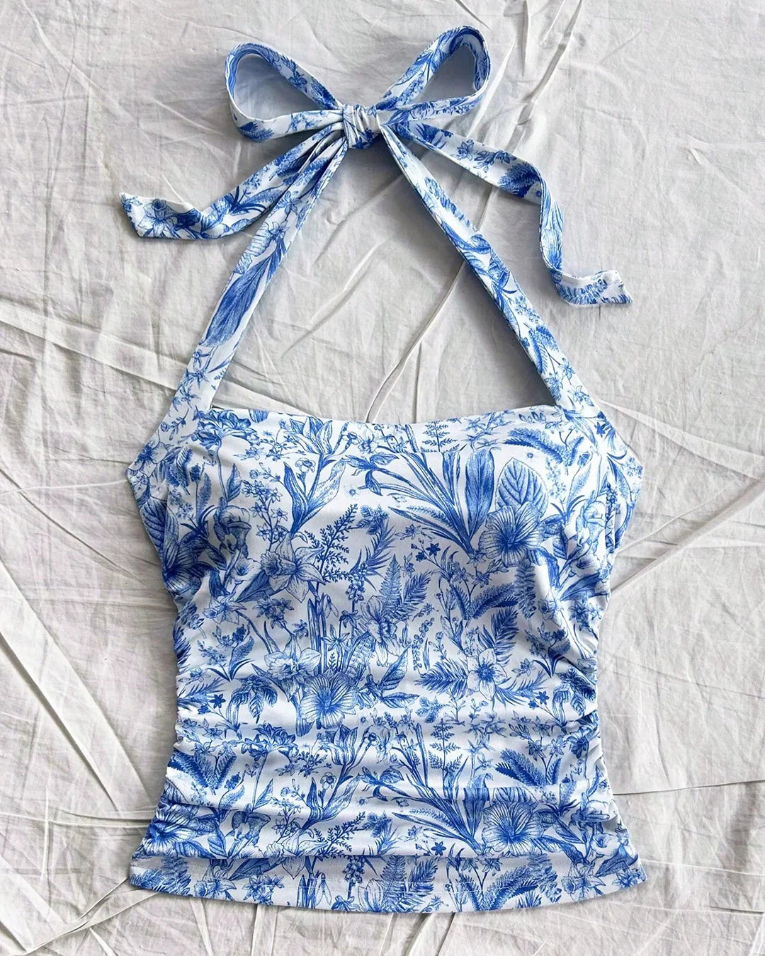 Floral Ruched Halter Neck Top with Tie Strap Detail