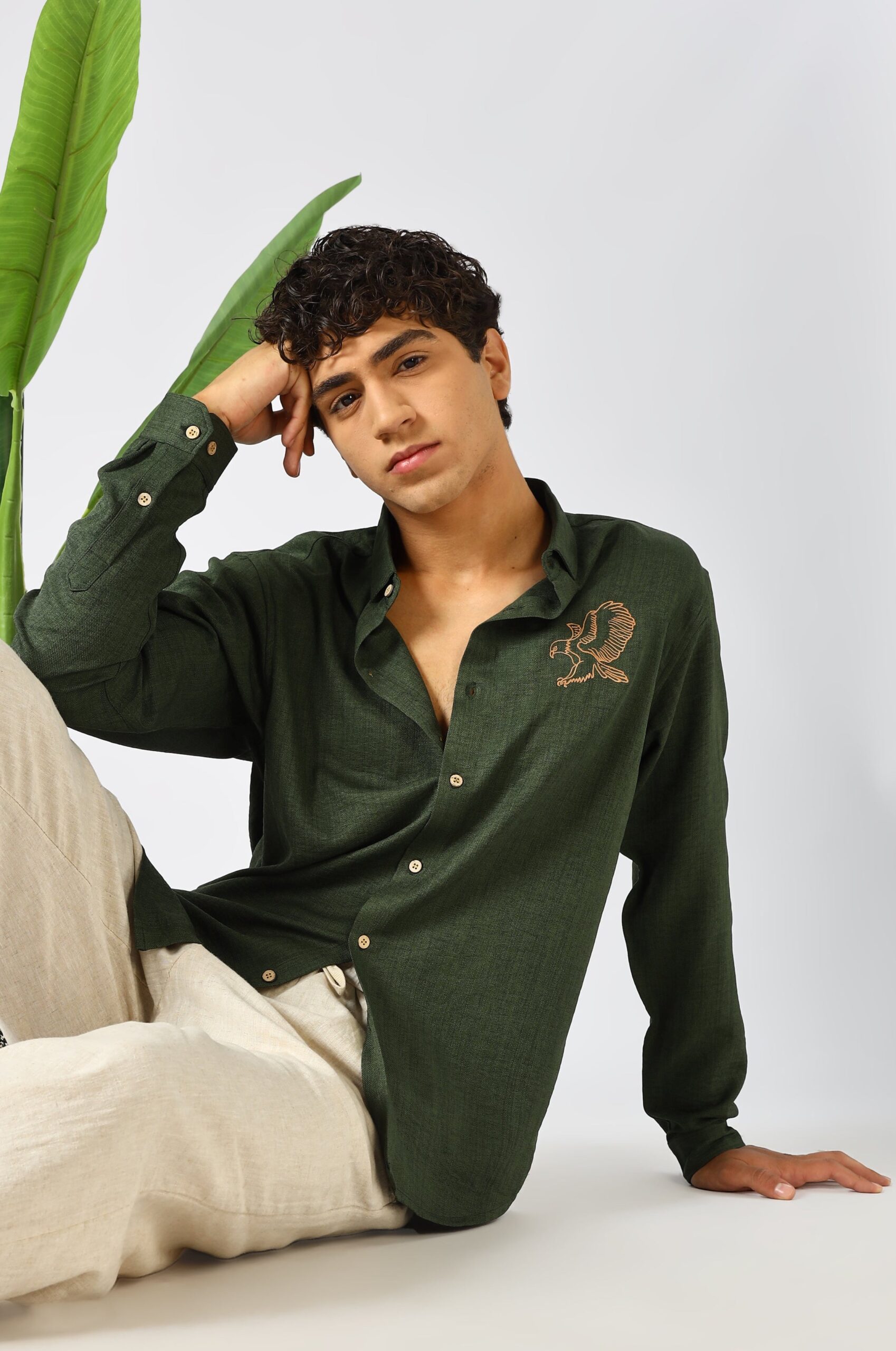 Forest green cotton shirt featuring a bold eagle motif embroidery. A confident casual style for everyday and outdoor wear.